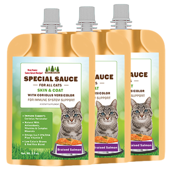 A groundbreaking first in the pet industry, our Special Sauce for Cats combines the immune-supporting power of Coriolus Versicolor with a rich blend of Vitamins, Omega 3-6-9, Minerals, and Natural Antioxidants to promote overall wellness and vitality. Praised as a wonder product for even the pickiest eaters, this formula doesn't just deliver top-tier nutrition—it does so with a delicious braised salmon flavor your cat will love when it is mixed with their food.
