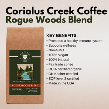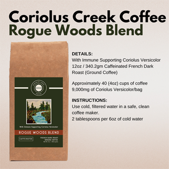 • Coriolus Creek Coffee Dark Roast Rogue Woods Caffeinated with Immune Supporting Coriolus Versicolor