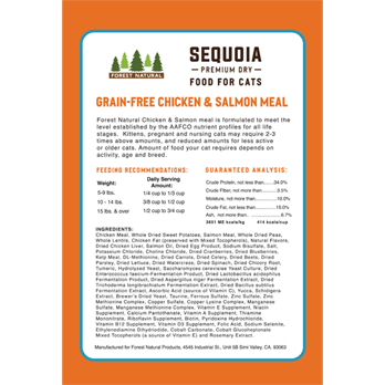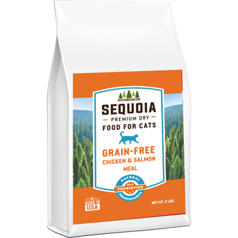 Reward your cat with a tasty meal by serving up a bowl of Sequoia Chicken and Salmon Dry Food! This crunchy kibble is crafted with non-GMO premium natural ingredients and is designed for felines from all life stages including kittens, pregnant and nursing cats and senior sidekicks, too! It’s packed with chelated minerals, prebiotics and probiotics to help support healthy immunity and digestion and it helps indoor cats with weight management. This dry cat food has a touch of turmeric for added anti-inflammatory properties and to top it all off, it’s loaded with real, recognizable ingredients like chicken meal, sweet potatoes, salmon meal, cranberries, blueberries, and more! Once they get their whiskers in this recipe, the'll be meowing for it every day!